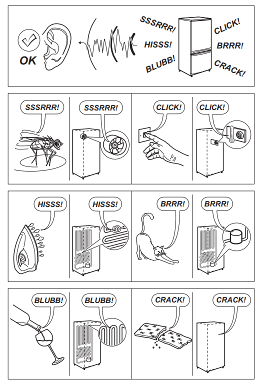 - Il frigorifero emette strani rumori; rumore metallico, clic, scoppiettio, vibrazione, motore in funzione